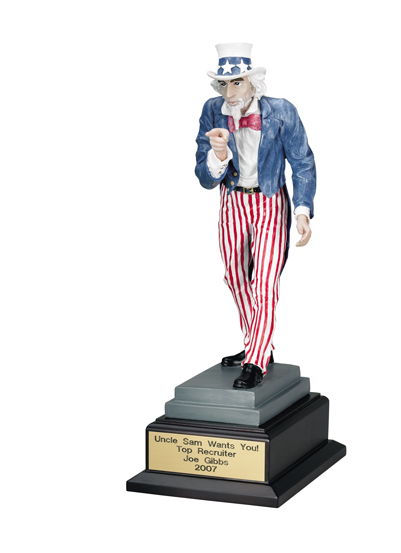 | TR 5731 Uncle Sam Wants You Resin Trophy 14 1/2" height. Base 7 1/4" x 5 1/4" x 2 3/8" Satin Brass Plate - 4" x 1 1/4" |